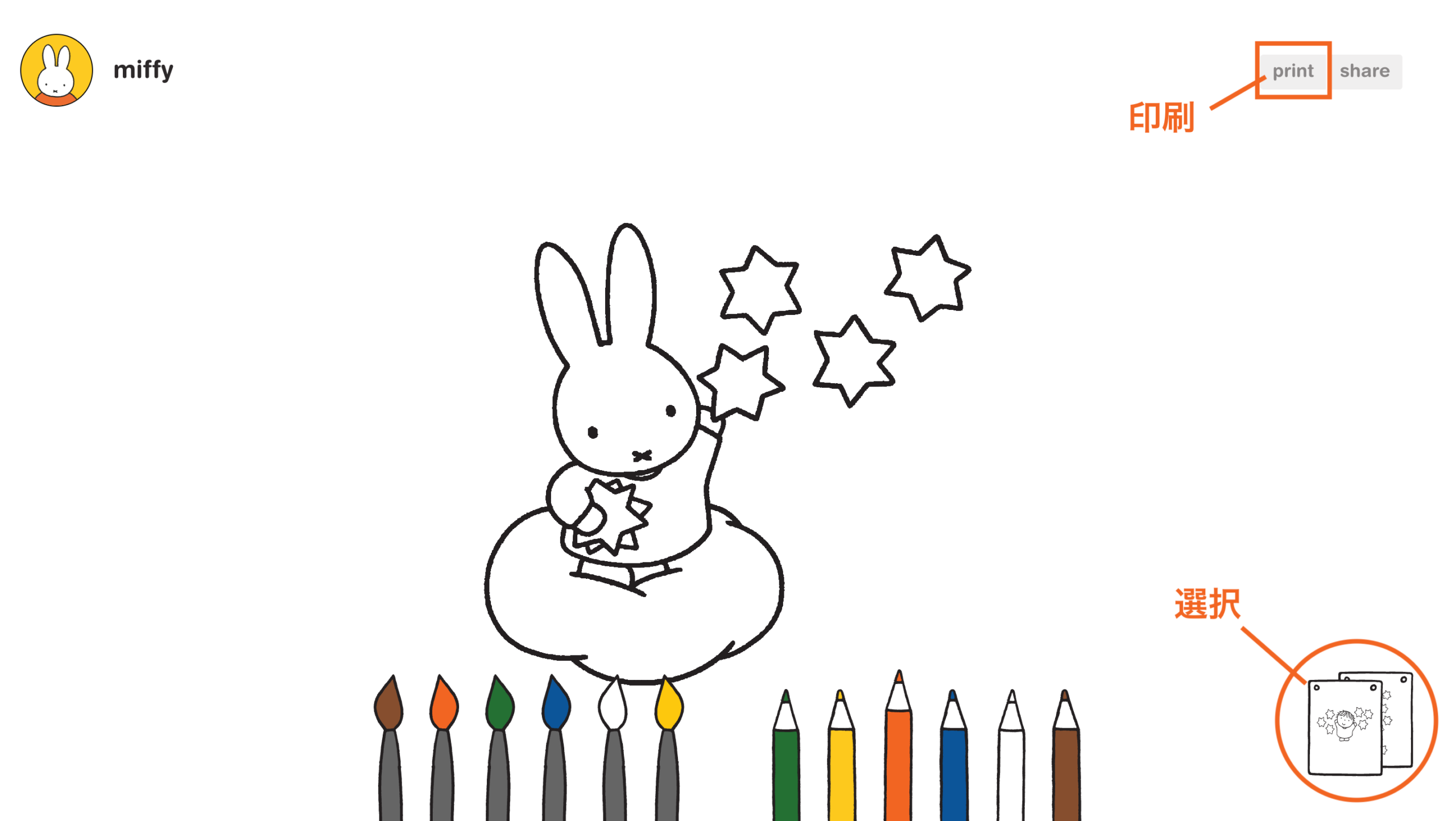 再生ボタンをおすと、デジタルコンテンツで直接PCなどから塗り絵ができるようになっています。右上のプリントボタンから印刷でき、右に出てくる小さなイラストの中から好きな図柄が選べます。